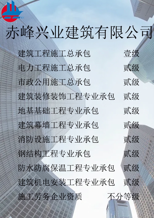 赤峰興業(yè)建筑有限公司簡介 赤峰興業(yè)建筑有限公司成立于1998年7月,位于內(nèi)蒙古赤峰市松山區(qū)。現(xiàn)已發(fā)展成為擁有建筑工程施工總承包壹級、電力工程施工總承包貳級、市政公用工程施工總承包貳級、承裝、修、試四級、?建筑裝修裝飾工程專業(yè)承包貳級、建筑幕墻工程專業(yè)承包貳級、消防設施工程專業(yè)承包貳級、地基基礎工程專業(yè)承包貳級、鋼結(jié)構(gòu)工程專業(yè)承包貳級、建筑機電工程專業(yè)承包二級、防水防腐保溫工程專業(yè)承包貳級以及建筑施工勞務等資質(zhì)的綜合性建筑施工企...